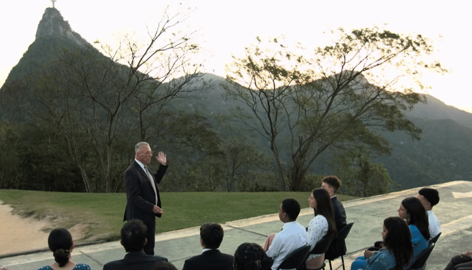 El élder Ulisses Soares, del Cuórum de los Doce Apóstoles, se encuentra junto a la estatua del Cristo Redentor en Río de Janeiro, Brasil, durante una transmisión mundial para jóvenes el domingo 27 de octubre. Imagen: ChurchofJesusChrist.org.