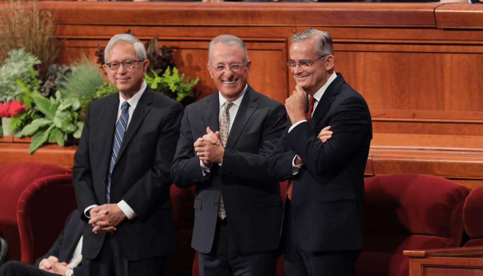 El élder Gerrit W. Gong, el élder Ulisses Soares y el élder Patrick Kearon, del Cuórum de los Doce Apóstoles, se reúnen antes de la sesión matutina del sábado de la 194.ª Conferencia General Semestral de La Iglesia de Jesucristo de los Santos de los Últimos Días, el 5 de octubre de 2024. Créditos: Cody Bell. Imagen: La Iglesia de Jesucristo de los Santos de los Últimos Días