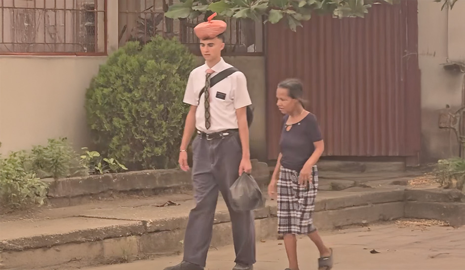 En otra escena, registrada en El Salvador, el servicio toma una forma distinta. Una persona transporta comida sobre la cabeza, una práctica común en muchas comunidades del país. La imagen refleja esfuerzo, equilibrio y resistencia física, pero también una realidad cotidiana donde llevar alimentos implica trabajo y constancia.