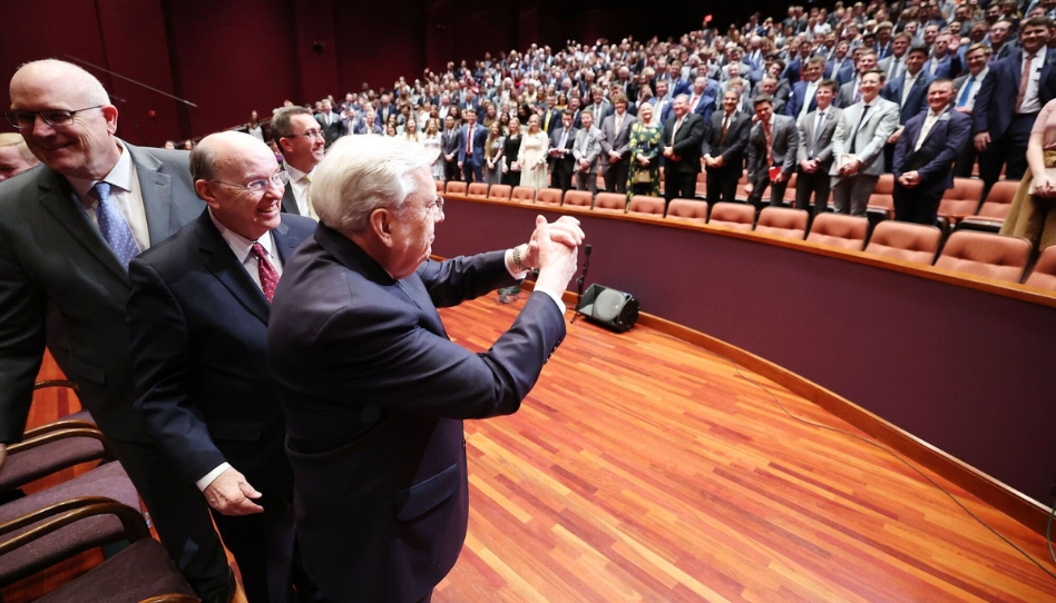 El presidente M. Russell Ballard, presidente en funciones del Cuórum de los Doce Apóstoles, se dirigió a los misioneros de la Misión Nueva York en el Centro de Visitantes del Templo de Washington D.C. en Kensington, Maryland, el viernes, 10 de marzo de 2023.