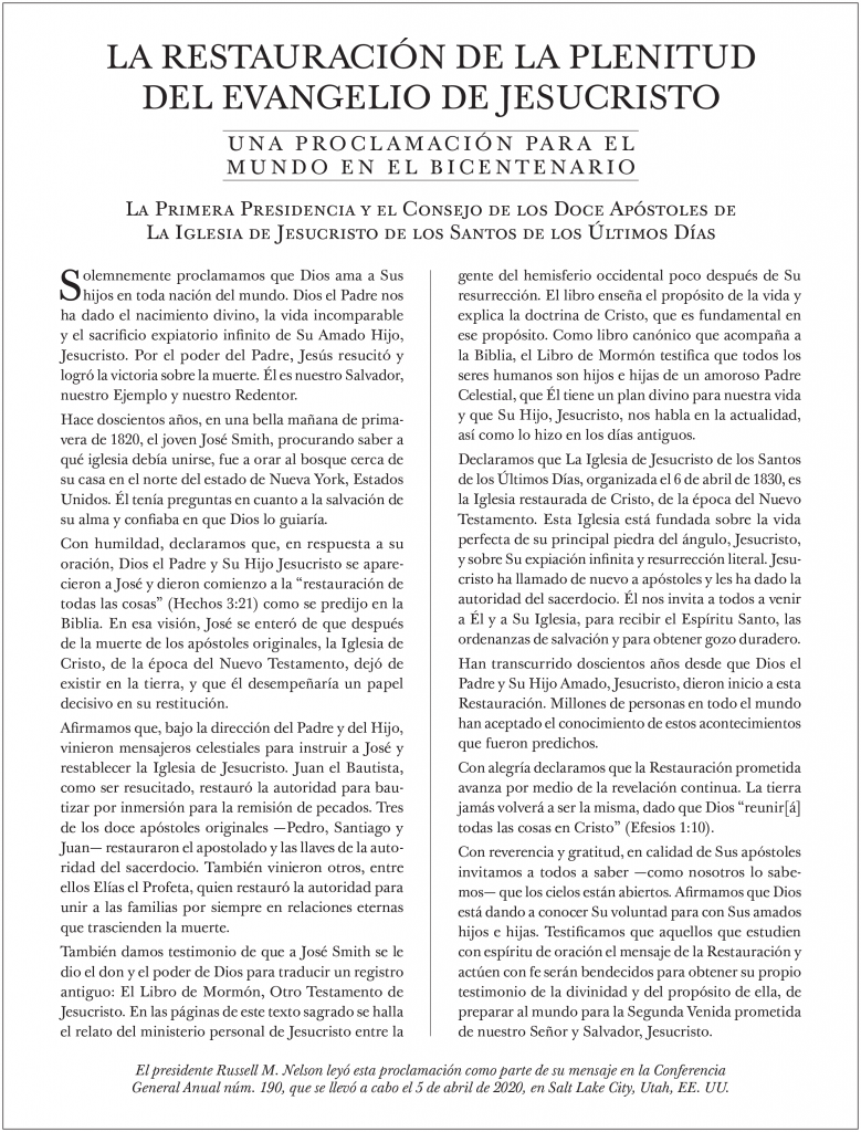 La Restauración de la Plenitud del Evangelio de Jesucristo: Una Proclamación para el Mundo en el Bicentenario