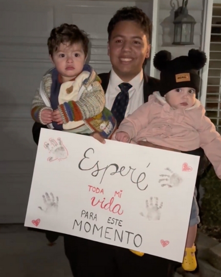 Los más pequeños de la familia también juegan un papel importante. Corren hacia él sin dudar, lo abrazan por la cintura y él responde levantándolos o cargándolos, como si quisiera aprovechar el tiempo perdido. Entre esos momentos aparece un cartel que dice: