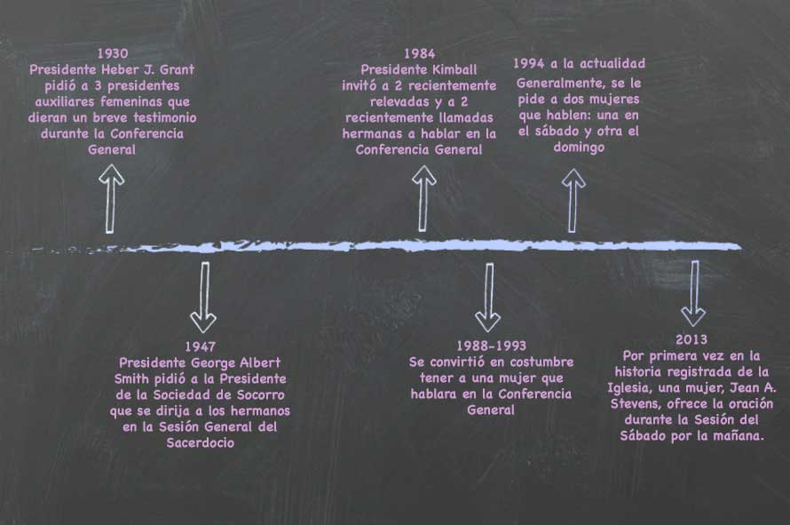 La primera mujer que habló en la Conferencia General fue Lucy Mack Smith en octubre de 1845. Ella solicitó la oportunidad de dirigirse a los santos durante una sesión en el templo. Después de eso, hay poca evidencia para probar si las mujeres recibieron invitaciones para hablar durante las sesiones generales. La verdad es que es muy poco probable.