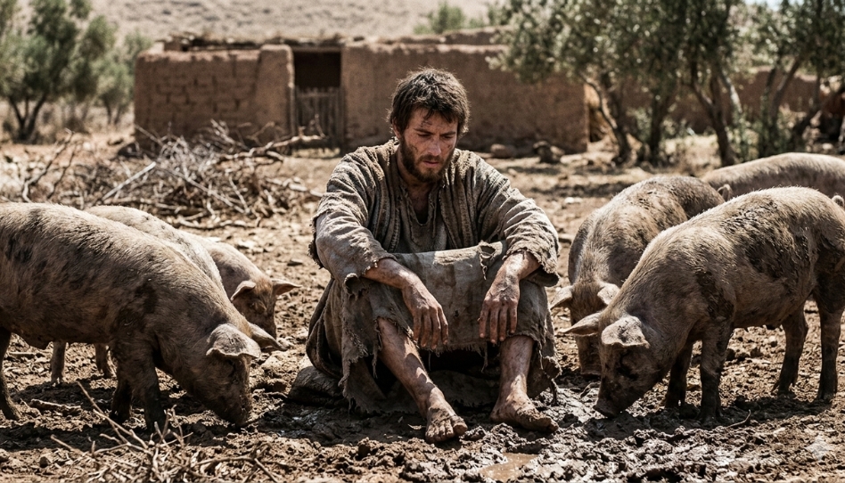 Cuando sus recursos se agotaron, terminó cuidando cerdos y deseando la comida que ellos comían, reflejando cuán lejos había llegado de la vida que conocía.